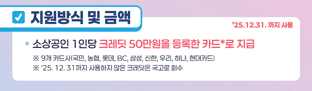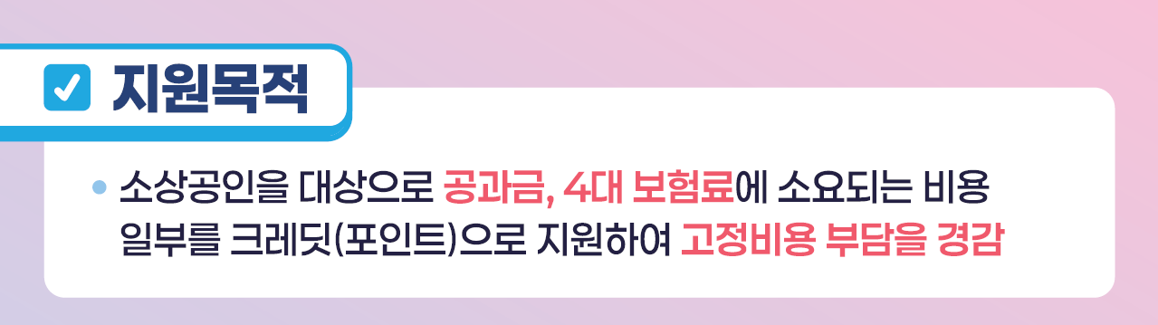 - 소상공인이 부담하는 공과금 및 4대 보험료에 대한 일부 금액을 카드 크레딧(포인트)로 지원