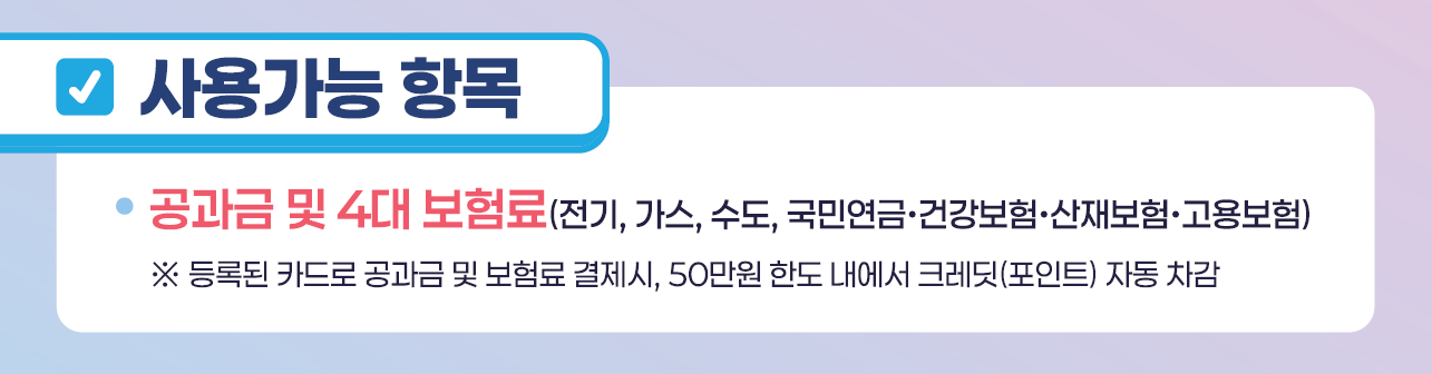 - 전기, 가스, 수도, 국민연금, 건강보험, 고용보험, 산재보험 등에 사용 가능