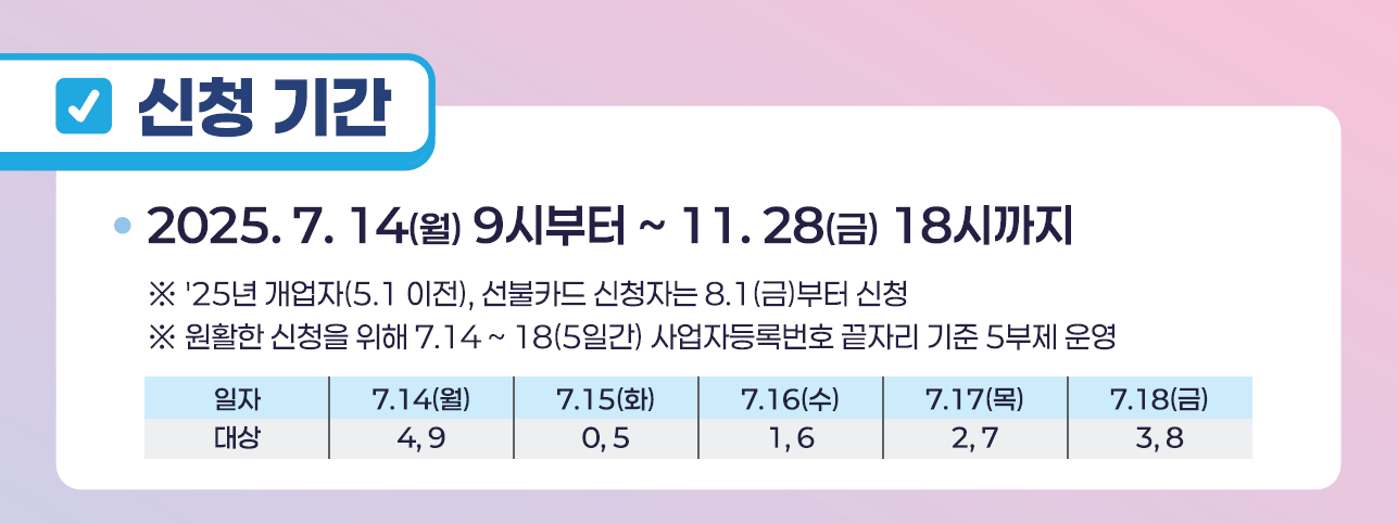 - '25년 개업자(5/1 이전), 선불카드 신청자는 8/1(금)부터 신청 가능