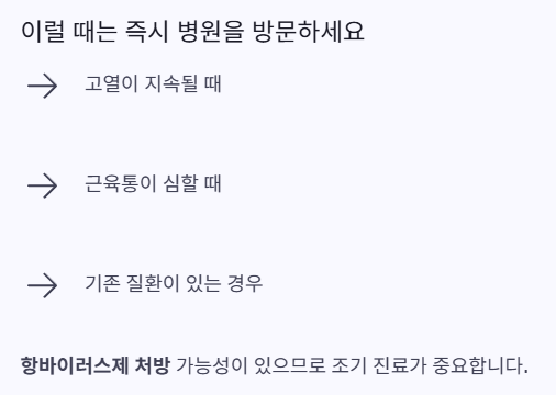- → 항바이러스제 처방 가능성이 있으므로 조기 진료가 중요합니다.