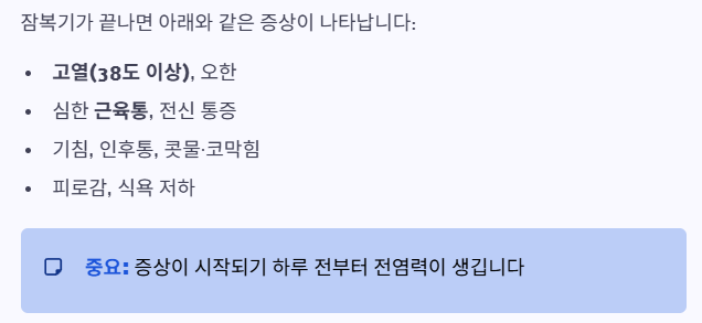 잠복기가 끝나면 아래 증상이 나타나는 경우가 많습니다: