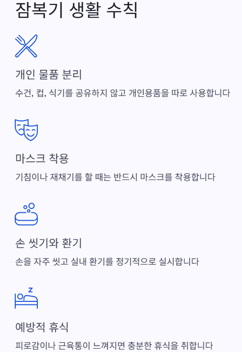 - 일부 국내 자료에서는 증상 소실 후 24시간 이후 격리 해제를 권고하기도 함