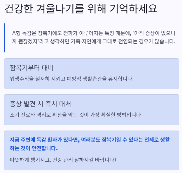 잠복기부터 위생수칙을 지키고, 증상이 보이면 즉시 대처하는 것이 독감 확산을 막는 가장 확실한 방법입니다.