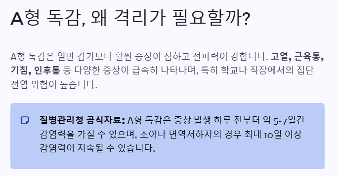 👉 A형 독감 잠복기 및 전염 시기 글을 통해 전염 타이밍을 함께 체크해보시길 추천드립니다.