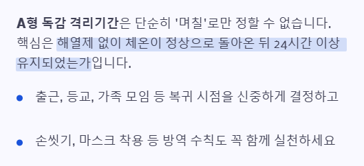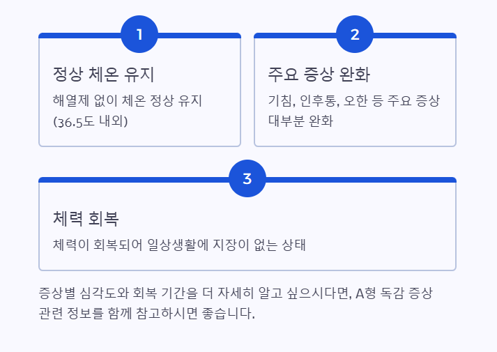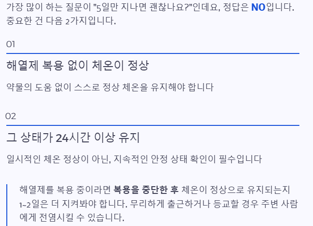 핵심은 해열제 없이 체온이 정상으로 돌아온 뒤 24시간 이상 유지되었는가입니다.