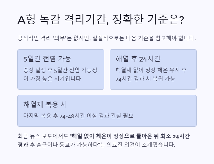 출근·등교 복귀 기준, 해열제 복용 여부, 격리 해제 타이밍까지 확실하게 알려드릴게요.