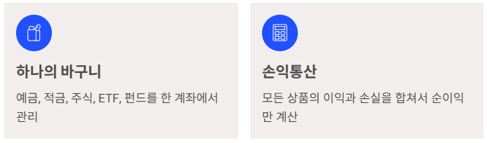 이 바구니(계좌) 하나에 예금, 적금, 주식, ETF, 펀드, ELS 등 다양한 상품을 담아 관리할 수 있습니다.