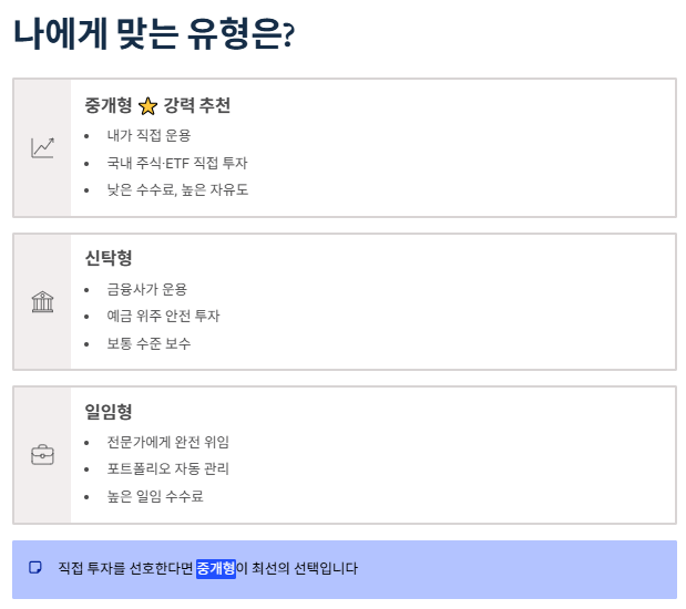 | 구분 | 중개형 (강력 추천 ⭐) | 신탁형 | 일임형 |