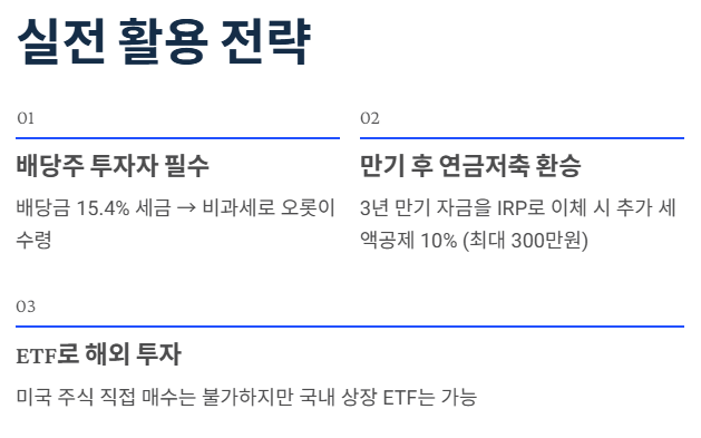 - 🚨 꿀팁(이월 가능): 올해 돈이 없어 1,000만 원만 넣었다면? 남은 1,000만 원 한도는 내년으로 넘어갑니다. 즉, 내년에는 총 3,000만 원까지 넣을 수 있습니다. 미리 만들어두는 게 무조건 유리한 이유입니다!