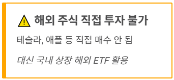 - 해외 주식 직접 투자 불가: 테슬라, 애플 같은 미국 주식을 직접 살 순 없습니다. 대신 국내에 상장된 해외 ETF (예: TIGER 미국나스닥100)는 투자가 가능하니 이를 활용하면 됩니다.