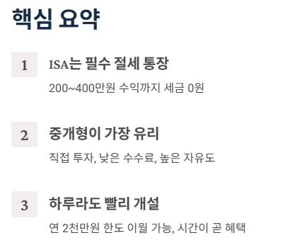 - 직접 투자를 원하면 '중개형 ISA'가 유리하며, 납입 한도는 연 2천만 원(이월 가능)이다.