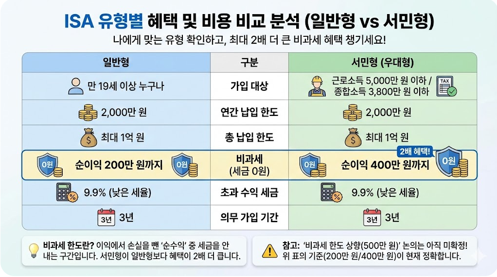 - 비과세 한도: 이익에서 손실을 뺀 순수익 중 세금을 안 내는 구간입니다. 서민형이 일반형보다 혜택이 2배 더 큽니다.