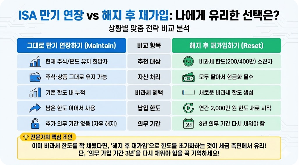 - 비과세 한도가 남았다면 '연장'을, 한도가 꽉 찼다면 '재가입'을 선택하는 것이 이득입니다.