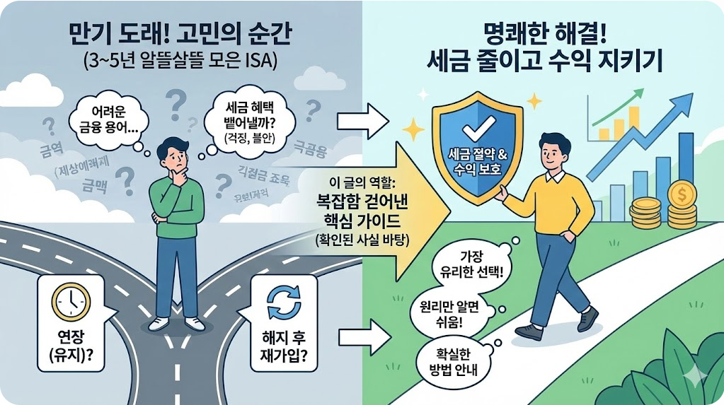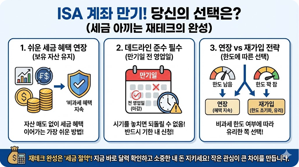 이 글은 소중한 목돈 관리를 위한 ISA계좌 만기연장의 핵심 정보를 담고 있습니다. 만기가 다가왔을 때 세금 혜택을 놓치지 않고 연장하는 구체적인 방법과 해지 후 재가입 중 무엇이 나에게 더 이득인지 알기 쉬운 우리말로 요약해 드립니다.