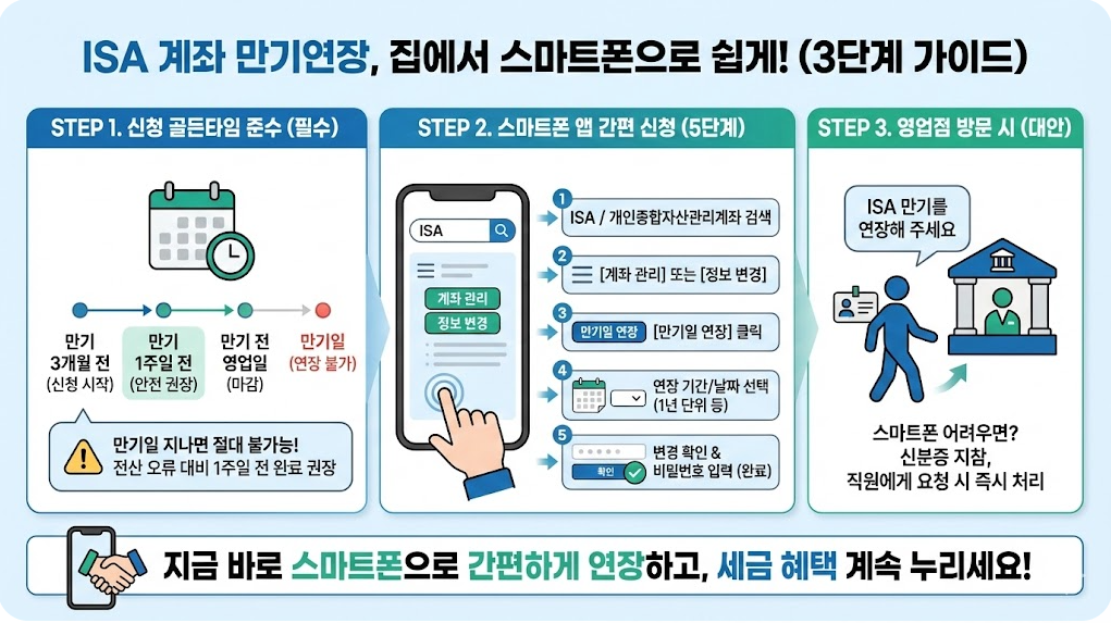 스마트폰 사용이 어렵다면 신분증을 챙겨 가까운 영업점을 방문하십시오. 직원에게 "ISA 만기를 연장해 주세요"라고 요청하시면 즉시 처리됩니다.