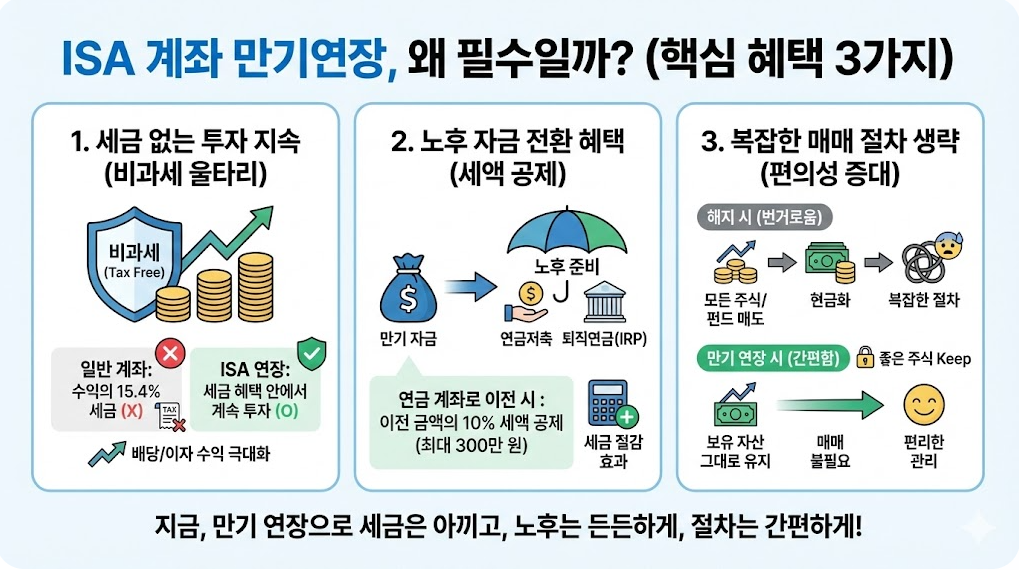 - ISA계좌 만기연장은 보유 자산을 팔지 않고 세금 혜택을 이어가는 가장 쉬운 방법입니다.
