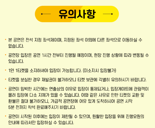 - 교통 및 주차 문제로 공연에 지연될 경우, 티켓 환불 및 변경 불가