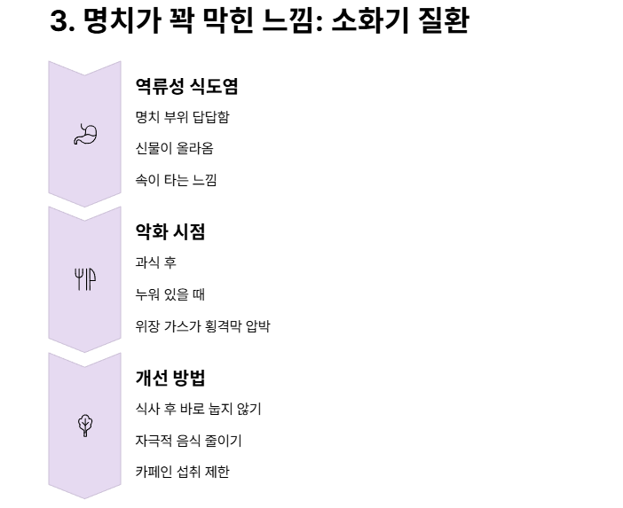 - 특징: 명치 부위가 꽉 막힌 듯 답답하고, 신물이 올라오거나 속이 타는 느낌이 듭니다. 특히 과식 후나 누워 있을 때 증상이 심해집니다. 위장에 가스가 차서 횡격膜을 압박할 때도 숨쉬기가 불편해집니다.