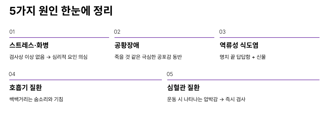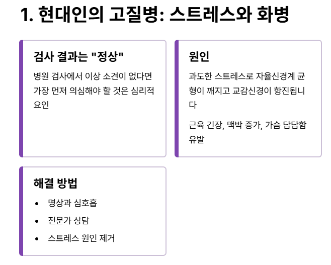 - 원인: 과도한 스트레스를 받으면 자율신경계의 균형이 깨지면서 교감신경이 항진됩니다. 이때 근육이 긴장하고 맥박이 빨라지며 가슴 답답함을 유발합니다. 한국인 특유의 '화병'도 여기에 해당합니다.