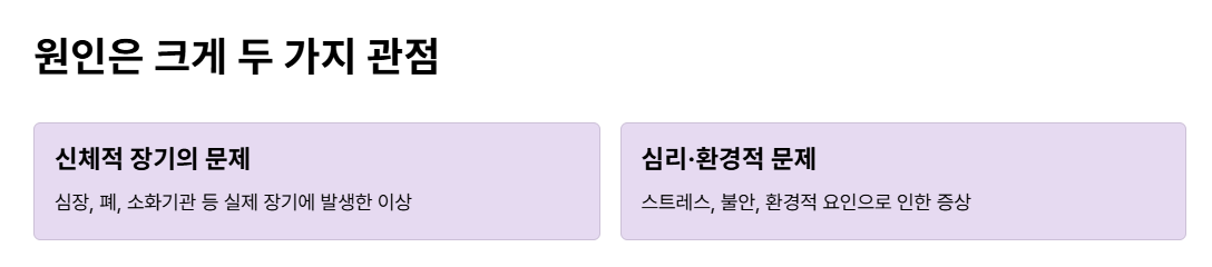가슴이 답답한 증상은 크게 '신체적 장기의 문제'와 '심리/환경적 문제' 두 가지 관점에서 바라봐야 합니다.