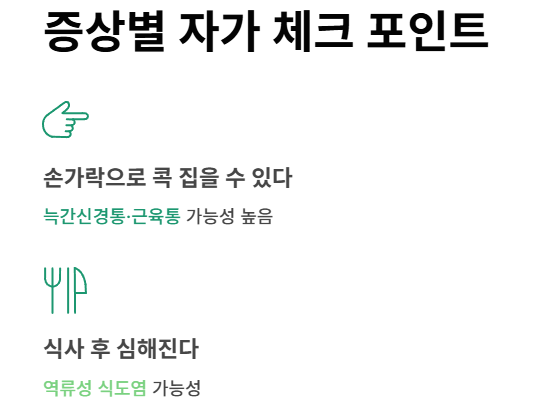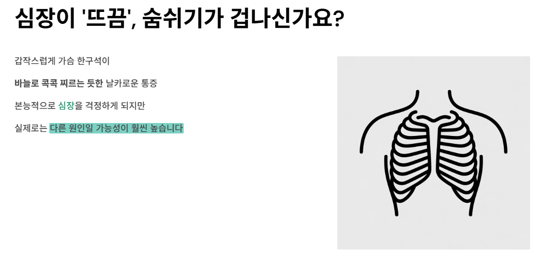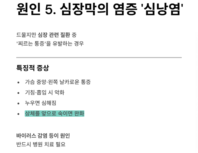 - 증상: 가슴 중앙이나 왼쪽이 날카롭게 찌르는 듯 아픕니다.
