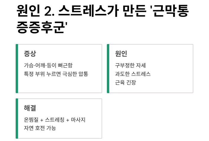 - 특징: 장시간 구부정한 자세로 스마트폰을 보거나 과도한 스트레스로 어깨와 가슴 근육이 긴장했을 때 발생합니다. 담이 걸린 것과 비슷하다고 보시면 됩니다.