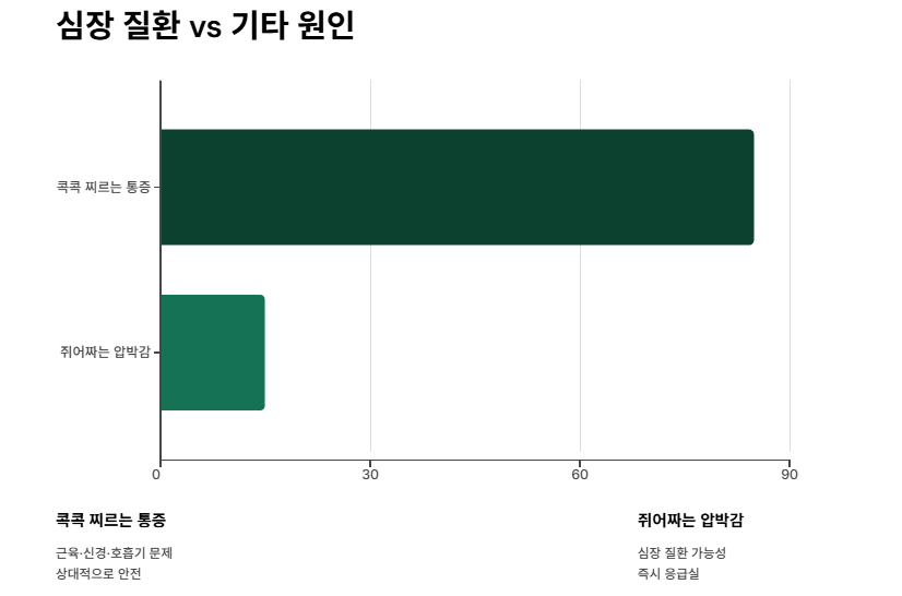 의학적으로 '콕콕 찌르는' 양상의 통증은 심장 자체의 문제보다 다른 원인일 가능성이 훨씬 높습니다.