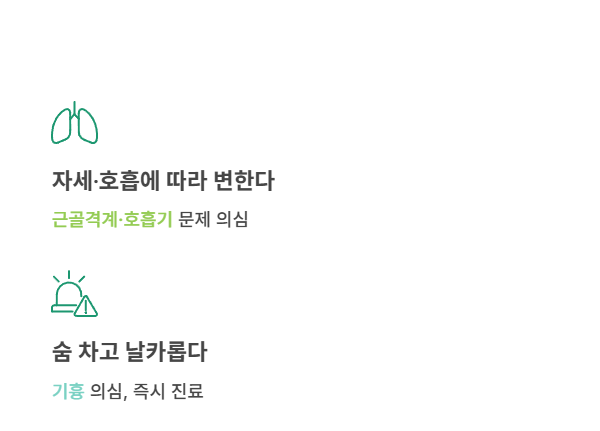 - 자세나 호흡에 따라 통증이 변한다면 근골격계나 호흡기 문제입니다.