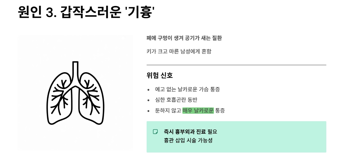 - 해결: 자연 치유되는 경우도 있지만, 정도가 심하면 흉관 삽입 시술이 필요하므로 흉부외과 진료가 필수입니다.