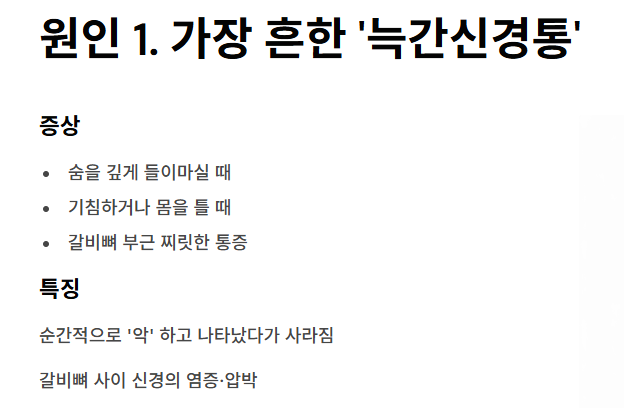 - 증상: 숨을 깊게 들이마시거나 기침을 할 때, 혹은 몸을 틀 때 갈비뼈 부근이 찌릿하고 콕콕 쑤십니다.