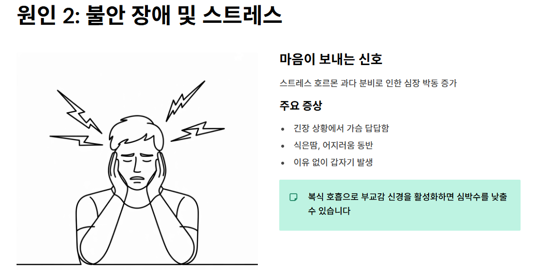 - 해결: 복식 호흡을 통해 부교감 신경을 활성화하면 심박수를 낮추는 데 큰 도움이 됩니다.