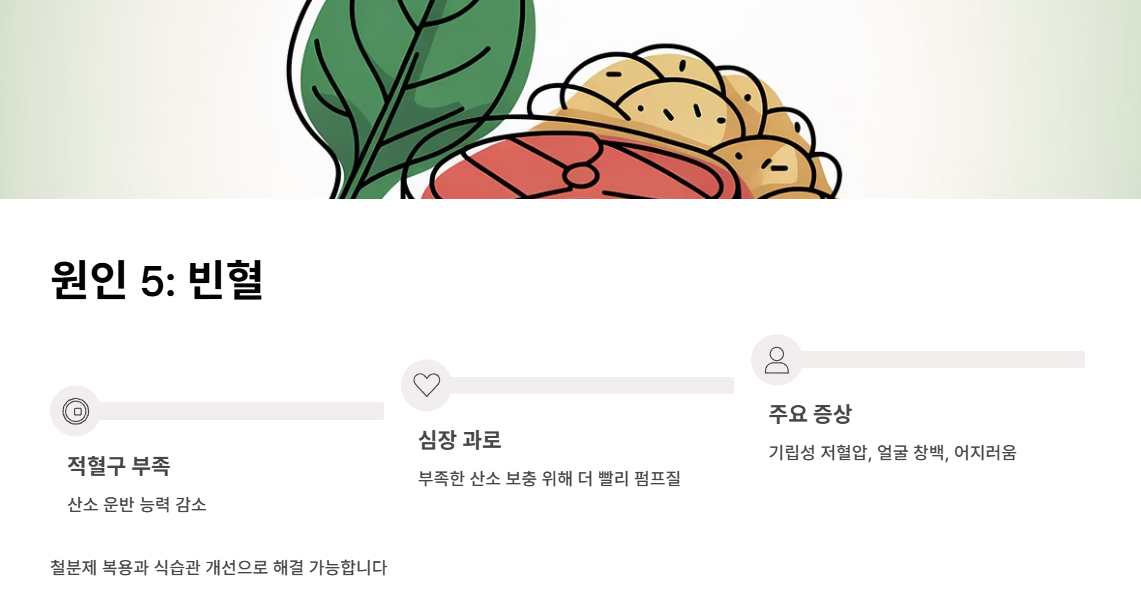- 특징: 앉았다 일어날 때 어지러움(기립성 저혈압)이 있거나 얼굴이 창백하다면 빈혈을 의심해 볼 수 있습니다. 철분제 복용으로 해결될 수 있습니다.