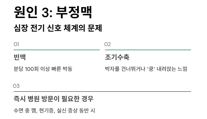 - 체크리스트: 두근거림 때문에 자다가 깬 적이 있거나, 현기증과 실신 증상이 동반된다면 즉시 심장내과를 방문하여 24시간 심전도 검사(홀터 검사)를 받아야 합니다.
