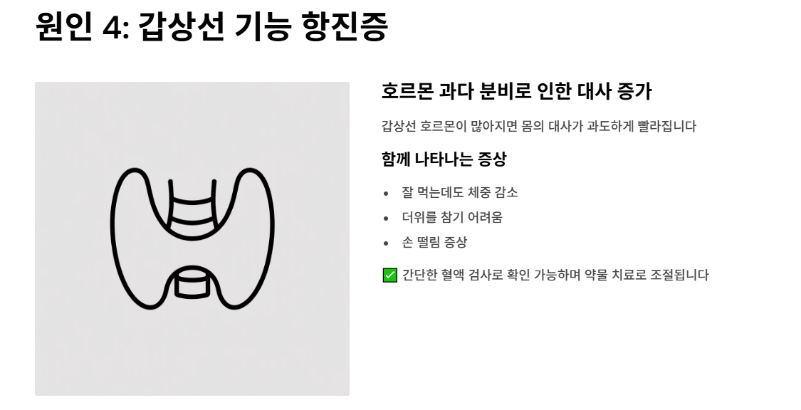 - 특징: 잘 먹는데도 살이 빠지고, 더위를 참기 힘들며, 손이 미세하게 떨리는 증상이 함께 나타납니다.