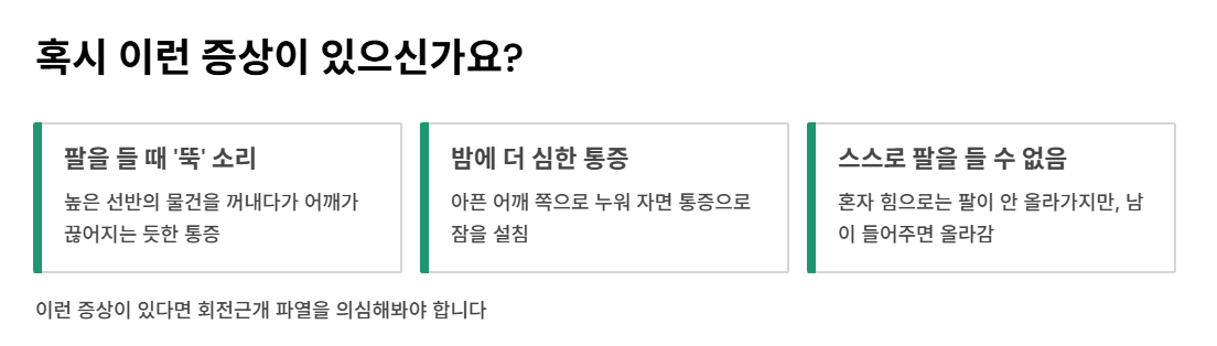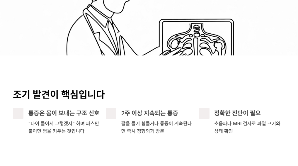 팔을 들기 힘들거나 통증이 2주 이상 지속된다면, 지체 없이 정형외과를 찾아 초음파나 MRI 검사를 받아보시길 권장합니다.