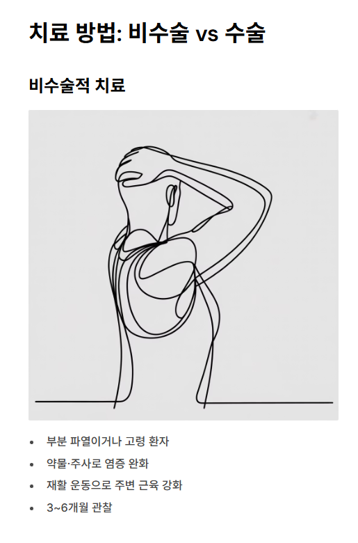- 관점 1 (비수술적 치료): 파열 크기가 작은 '부분 파열'이거나 고령의 환자라면 수술을 서두르지 않습니다. 약물, 주사 치료로 염증을 가라앉히고, 주변 근육을 강화해 찢어진 힘줄의 기능을 보완하는 재활 치료를 우선시합니다.