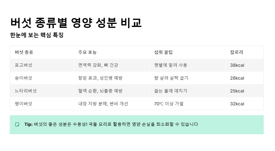 | 버섯 종류 | 주요 효능 (Key Benefit) | 섭취 꿀팁 | 칼로리 (100g당) |