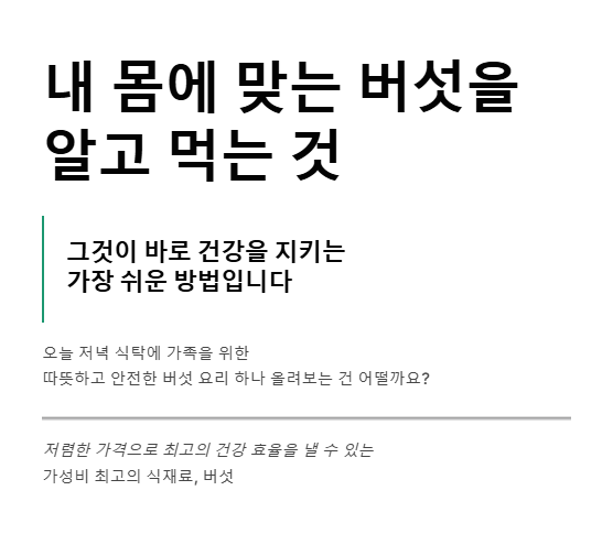 버섯은 저렴한 가격으로 최고의 건강 효율을 낼 수 있는 가성비 최고의 식재료입니다.