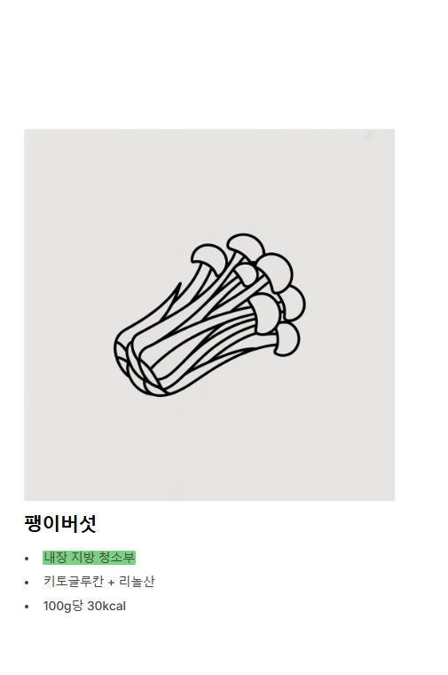 | 팽이버섯 | 내장 지방 분해, 변비 개선 | 반드시 70℃ 이상 가열 | 32kcal |