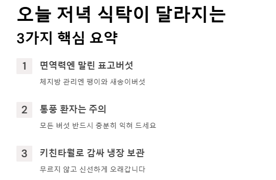 #버섯효능 #표고버섯 #팽이버섯다이어트 #면역력높이는음식 #버섯부작용 #통풍음식 #건강식단 #새송이버섯 #식약처건강정보 #제철음식