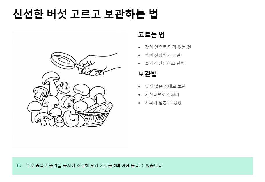 | 표고버섯 | 면역력 강화, 뼈 건강 | 햇볕에 말려 사용 추천 | 38kcal |