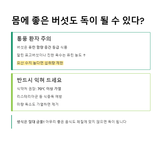 - 통풍 환자의 주의사항: 버섯은 퓨린(Purine) 함량이 '중간' 등급에 속하는 식품입니다. 하지만 말린 표고버섯이나 육수로 진하게 우려낼 경우 퓨린 농도가 높아집니다. 요산 수치가 높은 통풍 환자는 섭취량을 제한하는 것이 안전합니다.