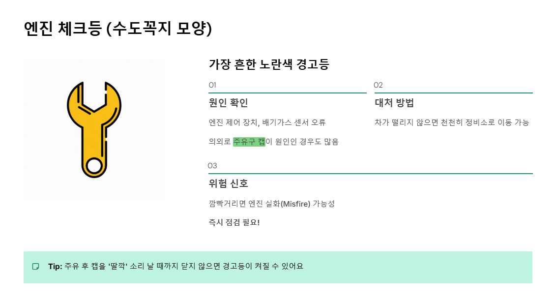- 주의: 만약 경고등이 깜빡거린다면 엔진 실화(Misfire) 등 심각한 문제일 수 있으니 즉시 점검받아야 합니다.