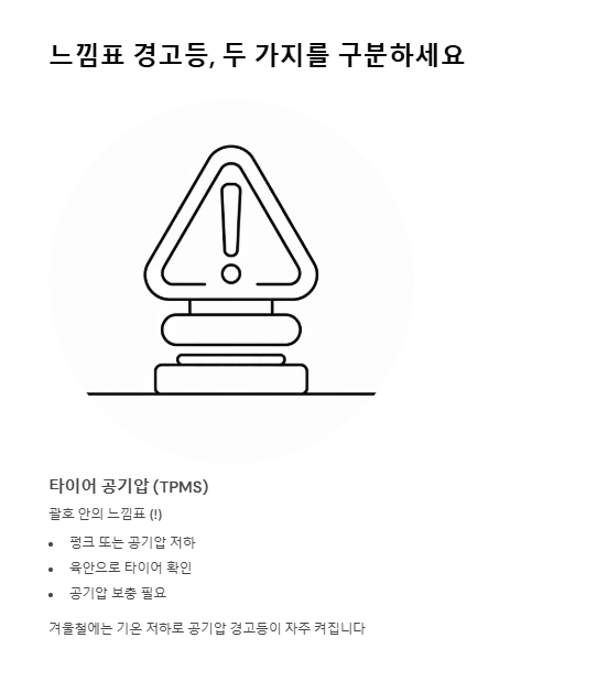 - 괄호 안의 느낌표 (!): 타이어 공기압 경고등(TPMS)입니다. 펑크가 났거나 겨울철 기온 저하로 공기압이 낮아진 경우입니다. 육안으로 타이어 상태를 확인하고 공기를 보충하세요.