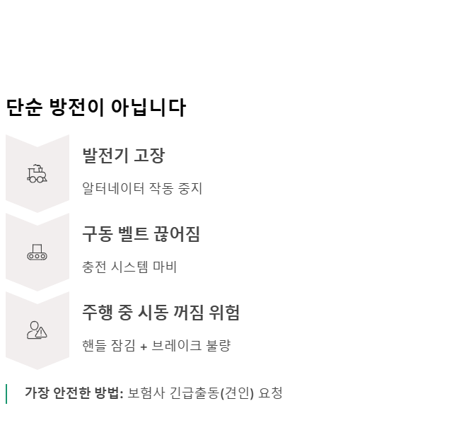 - 진짜 원인: 배터리를 충전해 주는 발전기(알터네이터) 고장이나 구동 벨트 끊어짐이 주원인입니다.