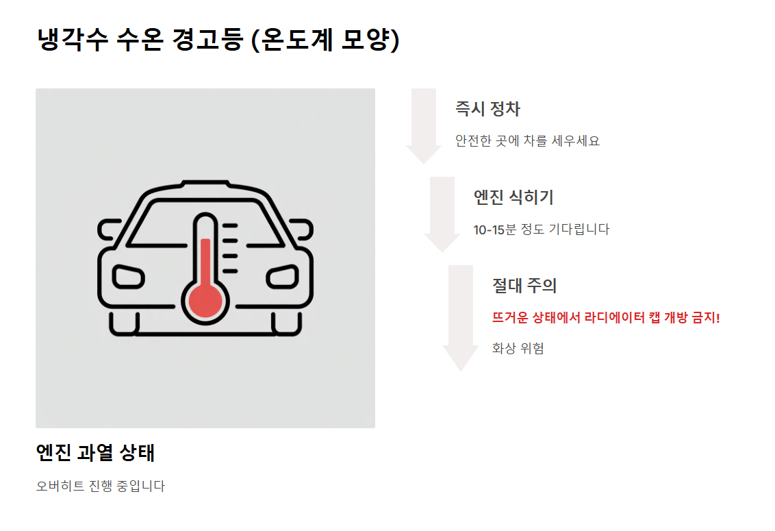 - 냉각수 수온 경고등 (온도계 모양): 엔진이 과열(오버히트)되고 있다는 뜻입니다. 즉시 정차하여 엔진을 식혀야 합니다. 이때 절대 뜨거운 상태에서 라디에이터 캡을 열면 안 됩니다. (화상 위험)