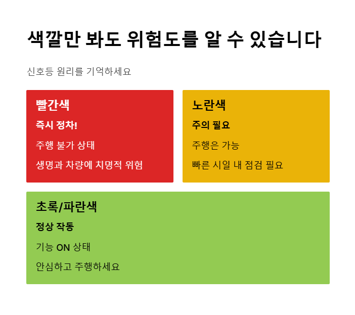 수십 가지 경고등을 다 외울 필요는 없습니다. 딱 하나, '신호등 색깔' 원리만 기억하세요.