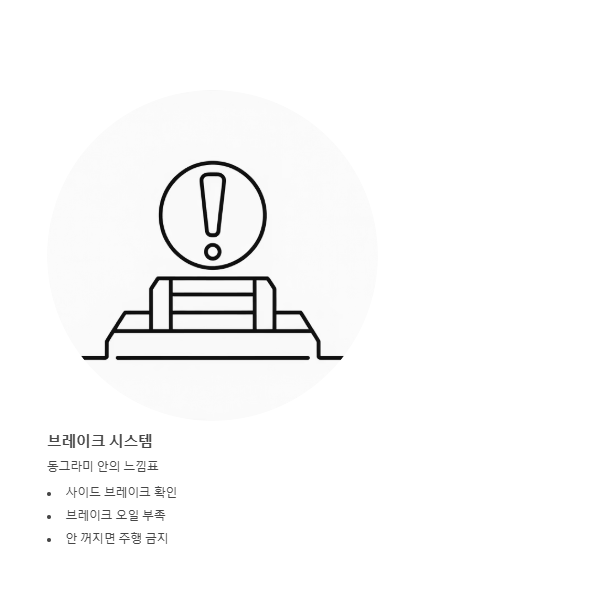 - 동그라미 안의 느낌표 (P) or (!): 사이드 브레이크가 걸려 있거나, 브레이크 오일이 부족하다는 뜻입니다. 사이드 브레이크를 풀었는데도 꺼지지 않는다면 브레이크가 작동하지 않을 수 있으므로 주행을 멈춰야 합니다.