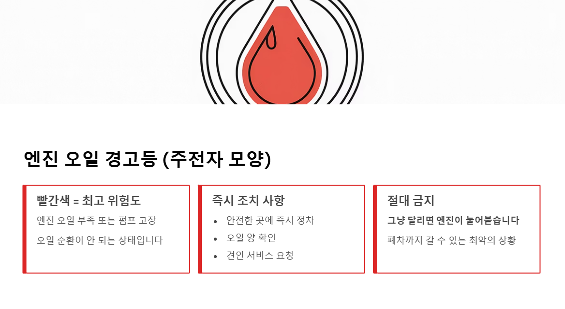 | 주전자 | 엔진 오일 | 빨강 | 매우 위험 | 즉시 정차, 견인 조치 (주행 금지) |