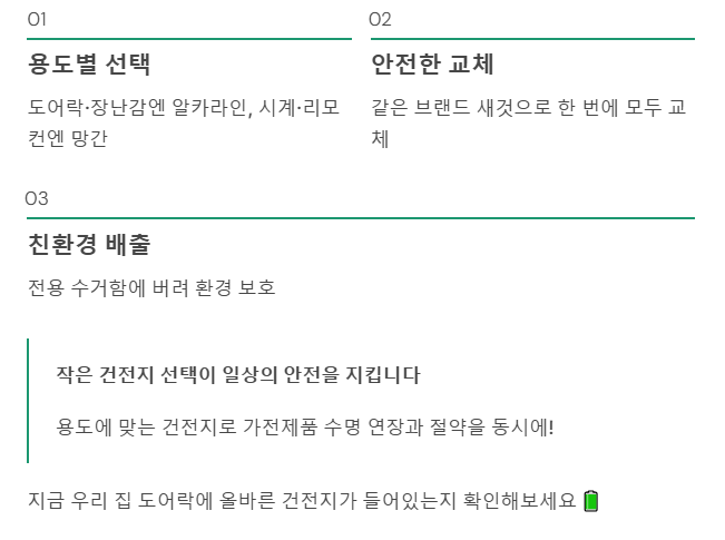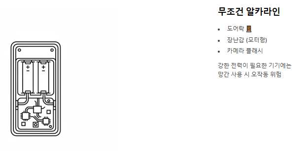 | 알카라인 | 높음 | 보통 | 도어락, 작동 완구, 무선 마우스 | 장기 방치 시 누액 주의 |